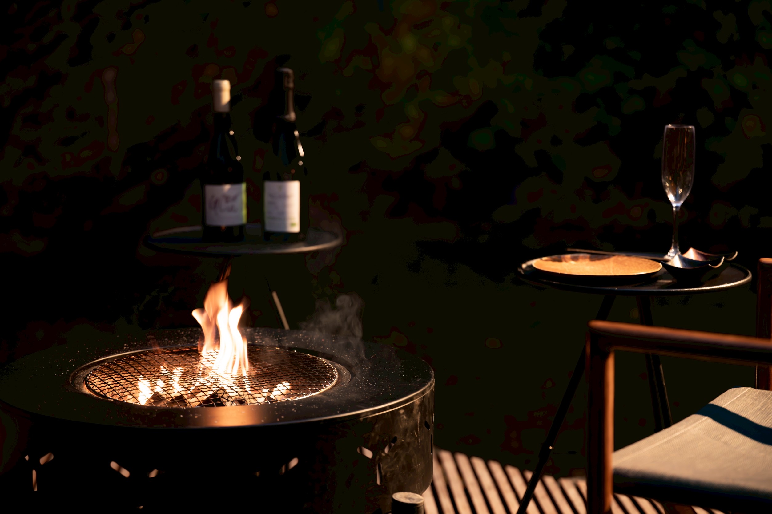 お料理・ドリンクはパーティーツリーデッキでのディナーと全く同じ内容をご提供いたします。軽量の焚き火台を設置し、心地よい炎の揺らぎとともにディナーをお楽しみいただけます。